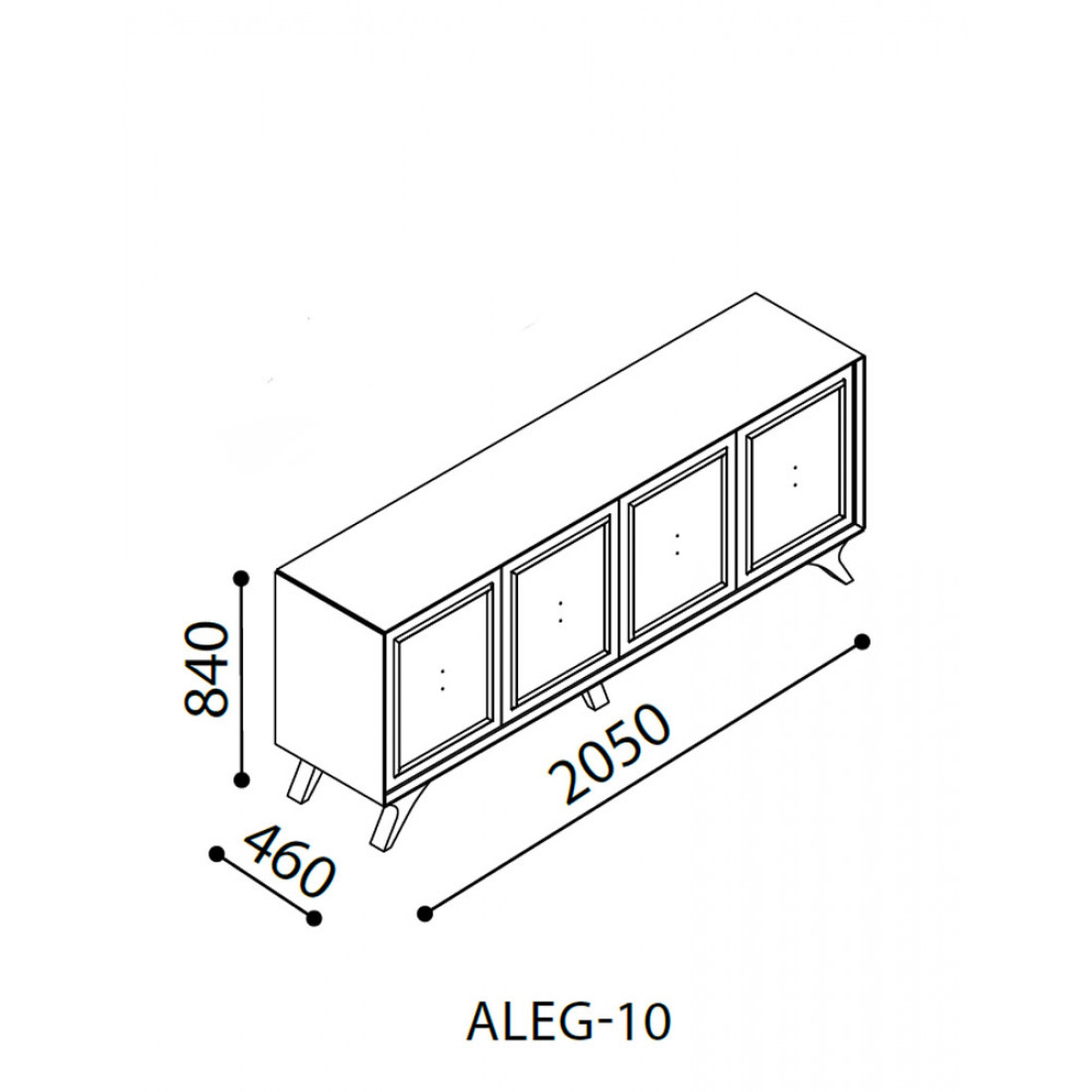 Длинный комод для посуды в гостиную ALEG-10 серии Алегро от Беллона средней высоты (840) станет прекрасным, многофункциональным дополнением интерьера гостиной и столовой. Ажурные ручки образуют единый декоративный элемент, сходясь в центре фасадов. В качестве материала для фасадов, столешницы и ножек использовался МДФ.