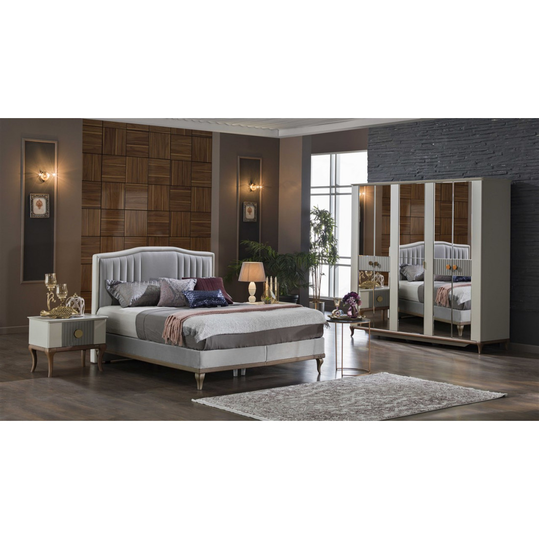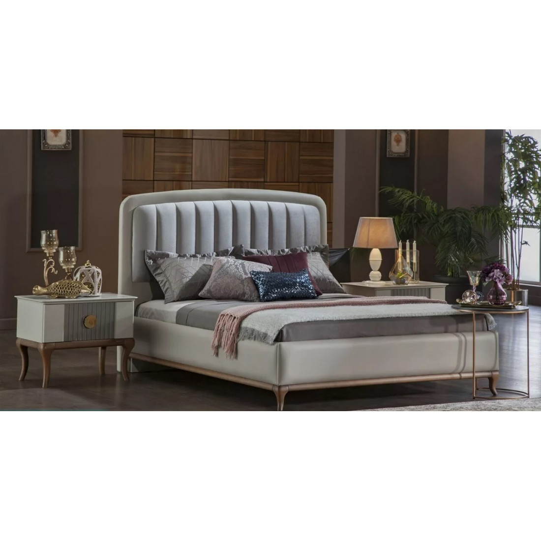 Кровать "Песаро" выполнена в классических светлых тонах коллекции. Светлое основание с деревянными ножками и мягкой центральной частью на спинке освежат вашу спальню на 100%.