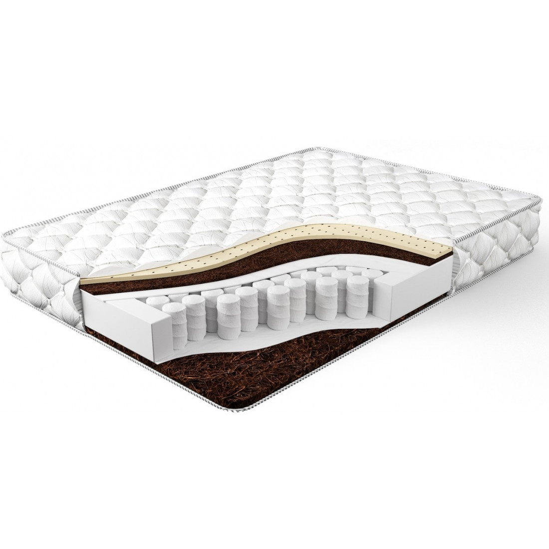 Наполнение: независимый блок TFK, высота блока 140 мм, латекс 20 мм с одной стороны, кокосовая плита 10/20 мм с 2-х сторон, износостойкий спанбонд с двух сторон, усиление по периметру - короб из ортопены.