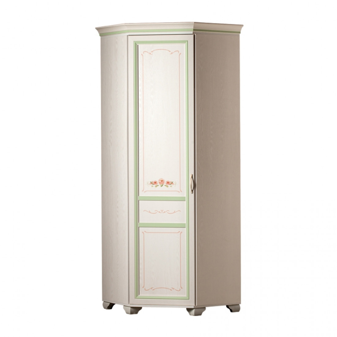 Золотистые ручки с белой патиной подчеркивают классический стиль мебели