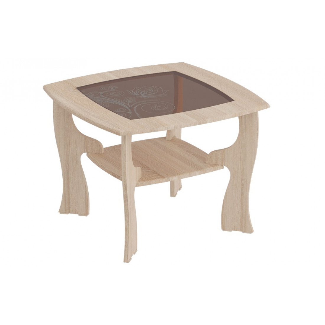 Элегантный журнальный столик в гостиную от фабрики МебельГрад  со стеклянной столешницей квадратной формы подойдет для оформления современного или классического интерьера. Стекло столешницы тонированное, декорировано пескоструйным рисунком. Варианты цветового исполнения: Дуб Сонома и Ель Карпатская, или сочетание контрастных Венге Мали и Клен с тиснением.